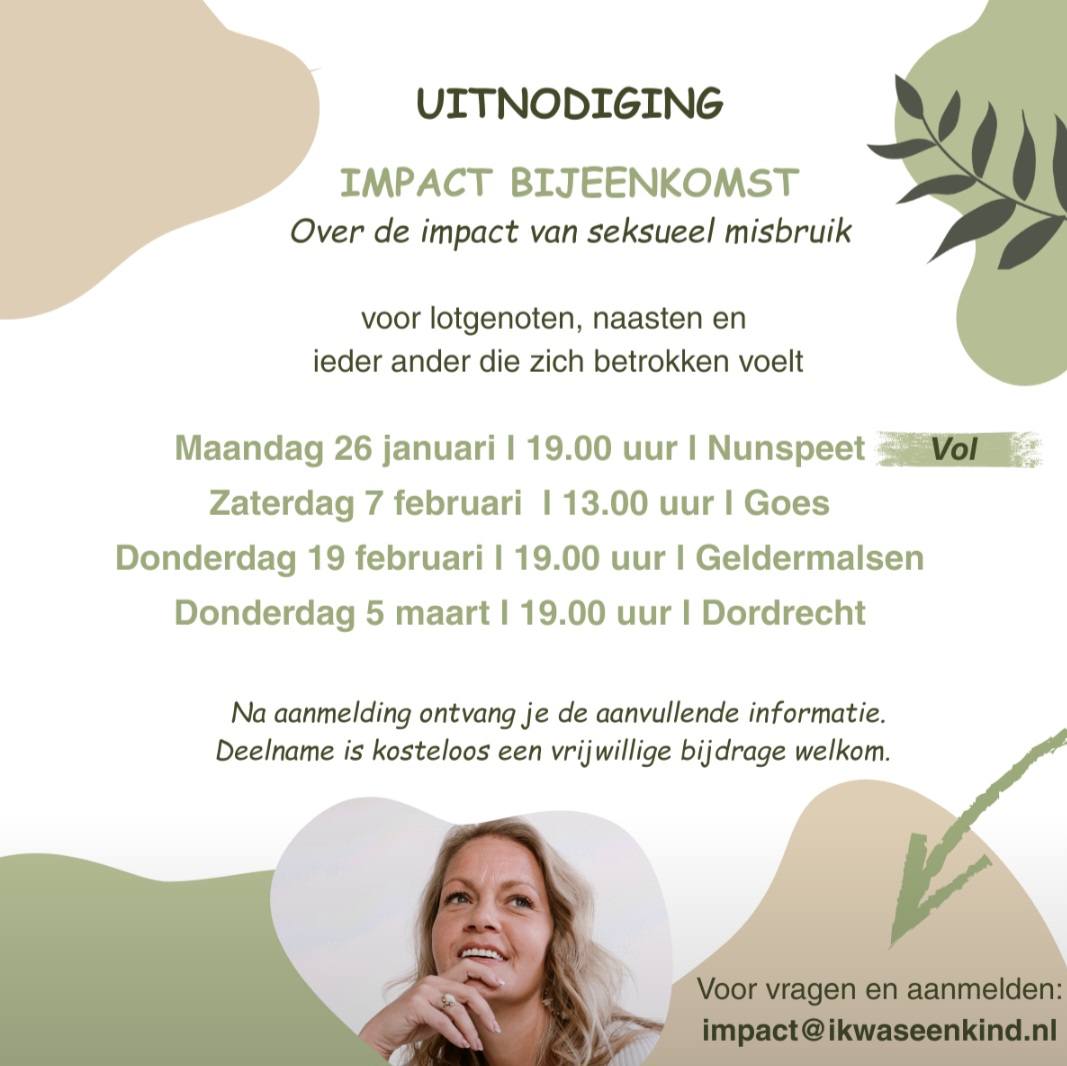 Bijeenkomst over de impact van seksueel geweld op levens, relaties en geloof.7 februari, Goes. Aanmelden noodzakelijk. Bij de Taakgroep Pastoraat is het verzoek binnengekomen om een uitnodiging met gemeenteleden en andere belangstellenden te delen voor een avond rond seksueel misbruik. Geen gemakkelijk onderwerp, wel een onderwerp waarvan we ons realiseren dat de impact groot is voor alle betrokkenen. De taakgroep heeft besloten om de uitnodiging met u te delen. Graag maken we, als taakgroep en predikant, ook kenbaar dat u, als u vragen of een verhaal heeft op dit terrein, contact op kunt nemen met mij als predikant. Dat kan in combinatie met het bezoeken van ondergenoemde bijeenkomst in Goes. Dat kan uiteraard ook los daarvan. Uitnodiging (van Stichting ‘Ik was een kind’): Mijn naam is Anneloes van ’t Licht. In maart 2025 werd de NPO/EO-documentaire ‘Ik was een kind’ uitgezonden, waarin mijn persoonlijke levensverhaal centraal staat. Een verhaal over seksueel misbruik en de diepe impact daarvan op mijzelf, mijn omgeving en ook op onze kerkelijke gemeente. Na het uitkomen van de documentaire ontving ik honderden reacties van lotgenoten, naasten en anderen die zich betrokken voelen bij dit thema. Een duidelijke rode draad daarin was de behoefte aan veilige plekken: plekken waar mensen gezien en gehoord worden, en waar dit kwetsbare onderwerp op een respectvolle manier bespreekbaar mag zijn. Vanuit die behoefte zijn de IMPACT-bijeenkomsten ontstaan. Dit zijn bijeenkomsten voor lotgenoten, naasten, omstanders en iedereen die zich betrokken voelt. Inmiddels hebben we twaalf bijeenkomsten mogen organiseren. Stuk voor stuk waardevolle en gezegende bijeenkomsten. Tijdens een IMPACT-bijeenkomst staan we niet zozeer stil bij wat er is gebeurd, maar bij de impact ervan op levens, relaties en geloof. Er is ruimte voor ontmoeting, (h)erkenning, herstel en hoop. De sfeer is veilig en respectvol, en er is professionele ondersteuning aanwezig. Belangrijk om te benadrukken: deze bijeenkomst is niet alleen voor mensen die zelf misbruik hebben meegemaakt. Juist in het samen aanwezig zijn en het naar elkaar luisteren ervaren we iets van de kracht en verbondenheid waartoe wij als gemeenschap geroepen zijn. Dat raakt voor ons ook zo aan de kern van kerk-zijn. Daarom nodig ik u van harte uit voor een IMPACT-bijeenkomst op zaterdagmiddag 7 februari van 13.00 - 16.30 uur in Goes. Ook predikanten, ambtsdragers en andere betrokkenen zijn van harte welkom om aan te sluiten. Deelname is kosteloos, een vrijwillige bijdrage welkom. Aanmelden kan via impact@ikwaseenkind.nl. Na aanmelding ontvangt men de aanvullende praktische informatie. Voor de aanmelding dient u zelf zorg te dragen. Verdrietig genoeg past ook het leven met de gevolgen van seksueel misbruik bij het thema ‘Je bent niet alleen’. Van harte hoop ik dat het benoemen en erkennen daarvan kan helpen om heilzaam verder te gaan. Namens de Taakgroep Pastoraat, Ds. Karin van den Broeke | ||